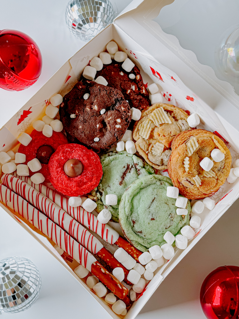 The box includes 2 chocolate marshmallow peppermint cookies, 2 ruffles chocolate chunk cookies, 2 chocolate cherry thumbprint cookies, 2 Andes mint cookies, and 4 chocolate dipped pretzel sticks. Garnished with mini marshmallows. (12 pieces total)