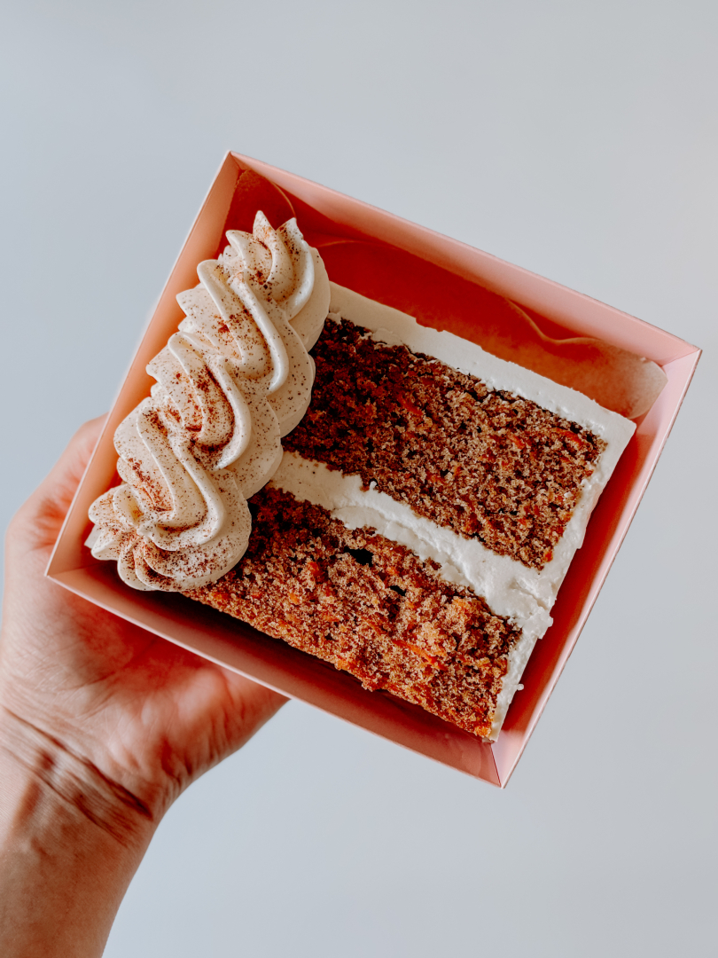 Cake slices are 4.5″ length x 4″ height x 1.25″ thickness.